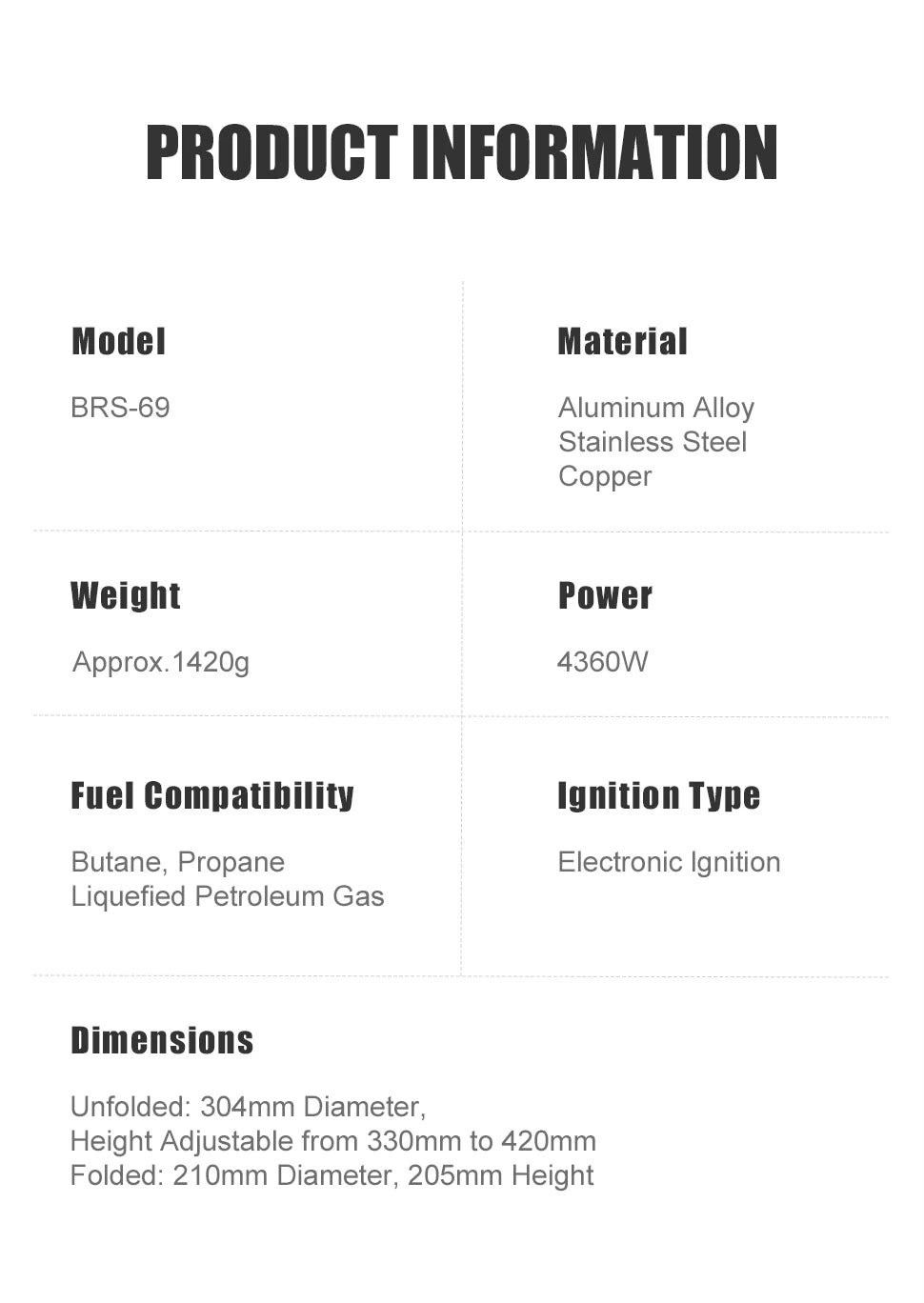[ Compact& Portable ] The stove's design balances spaciousness and compactness; it spans 304mm in diameter and stands between 330-420mm tall when in use. For easy transportation and storage, it collapses into a mere 210mm by 205mm, showcasing its portable nature.