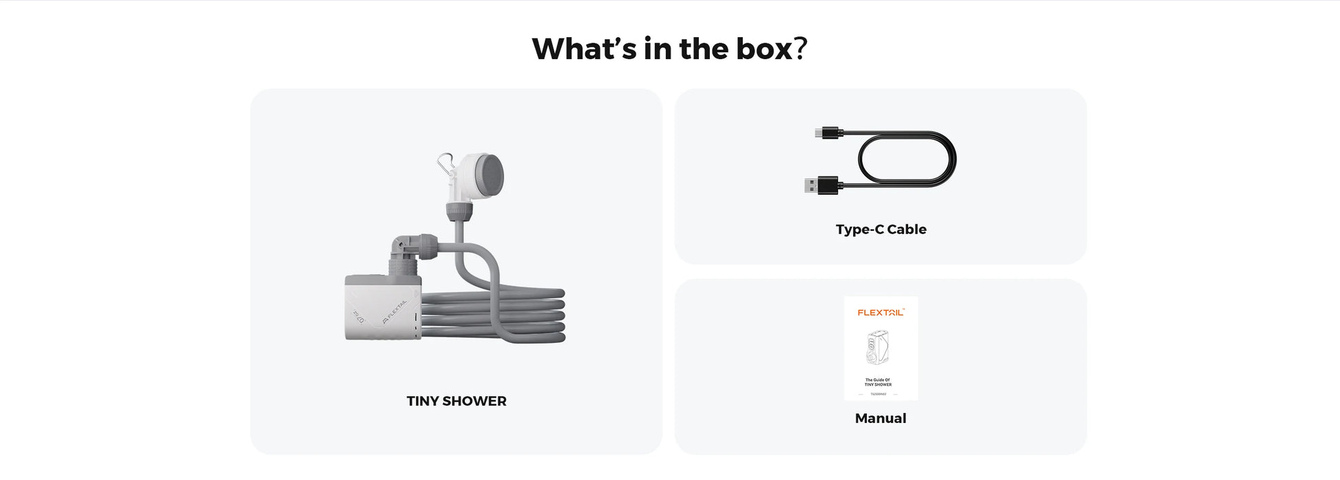 Package Contents: TINY SHOWER x 1, Type-C Cable x 1, User Manual x 1, Airtight Rings