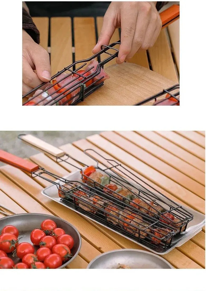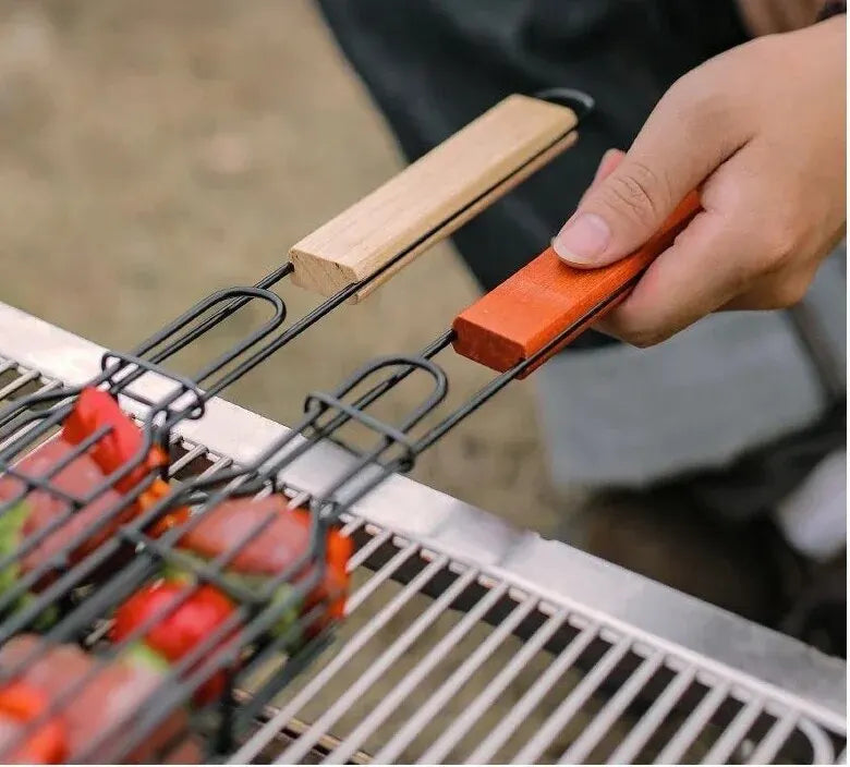 Outdoor Wooden Handle Barbecue Cage Camping Meat and Vegetable Barbecue Net Rack Picnic Barbecue Tools